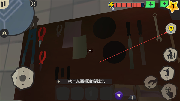 2、當任務要求找個東西把油箱戳穿時,在工具區(qū)域?qū)ふ液线m的工具如尖銳物品,用于戳穿油箱。