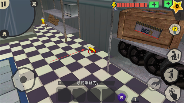 3、按照尋找螺絲刀的提示,在場景如倉庫的格子地板區(qū)域中找到螺絲刀,用于后續(xù)的解謎或破壞操作。