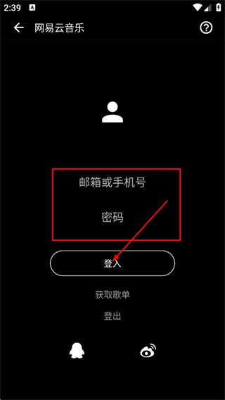 4、在網(wǎng)易云音樂(lè)登錄頁(yè)面,輸入郵箱或手機(jī)號(hào)、密碼后點(diǎn)擊登入,完成登錄操作。