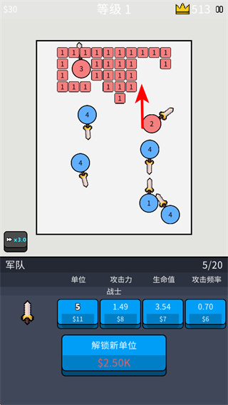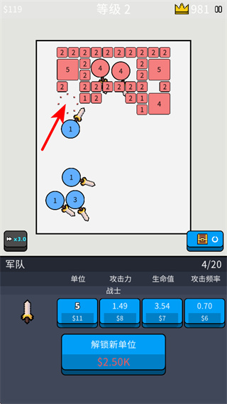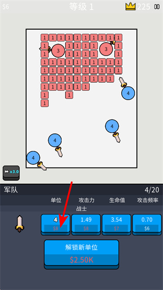 2、升級單位的攻擊力等屬性,可提升單位的戰(zhàn)斗能力,升級時需消耗金幣,建議優(yōu)先升級核心戰(zhàn)斗單位以提高清場效率。