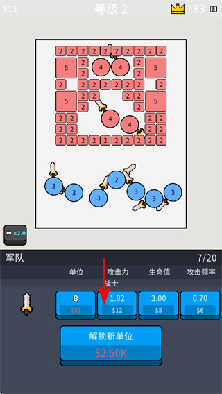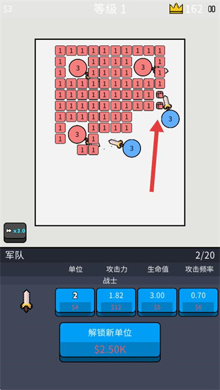 2、游戲中派遣單位如戰(zhàn)士攻擊數字區(qū)域,攻擊時優(yōu)先選擇數字小的區(qū)域以快速推進,注意觀察單位攻擊力生命值搭配。