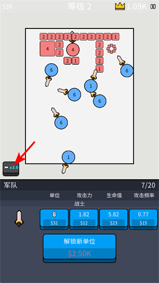 3、點擊升級單位的數值如攻擊力,可提升單位的戰(zhàn)斗能力,升級時需消耗金幣,升級核心作戰(zhàn)單位以提高清場效率。