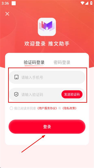 3、在登錄頁面輸入手機號、獲取并填寫驗證碼,勾選協(xié)議后,點擊登錄完成登錄操作。