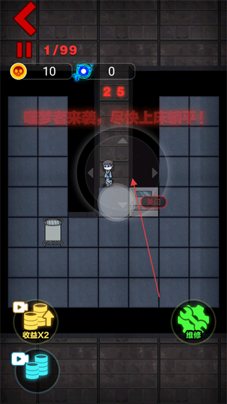 1、進(jìn)入挑戰(zhàn)模式,噬夢(mèng)者將會(huì)在指定時(shí)間到來,通過滑動(dòng)屏幕任意位置控制角色尋找安全的房間。