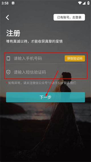 3、在注冊(cè)頁面,輸入手機(jī)號(hào)碼驗(yàn)證碼后,點(diǎn)擊下一步,完成注冊(cè)流程。