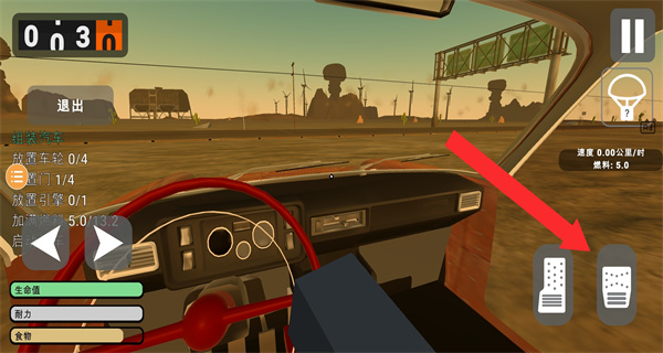 4、汽車組裝部分完成后,進(jìn)入駕駛的界面,通過油門和剎車按鈕控制汽車行駛,注意觀察燃料余量和行駛速度。