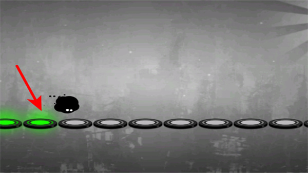 2、操控黑色小角色在綠色圓環(huán)上跳躍前進,跟隨圓環(huán)的亮滅時機操作,確保角色持續(xù)移動。