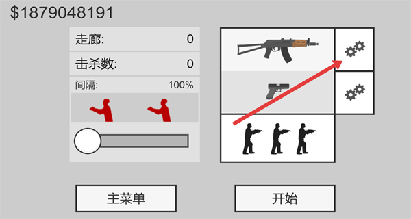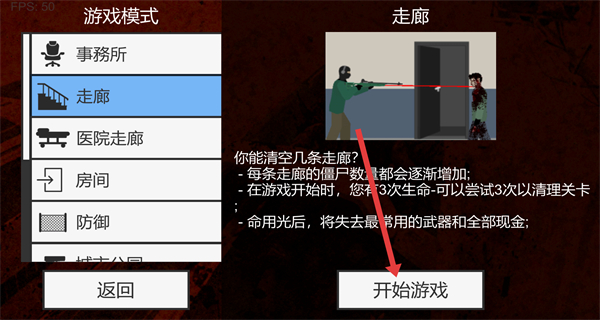 1、在像素射擊世界游戲中,選擇“走廊”游戲模式,點(diǎn)擊開始游戲進(jìn)入游戲準(zhǔn)備界面。