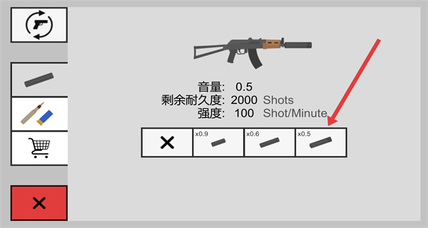 4、在消音器選擇界面,選擇合適的消音器如x0.5倍率的消音器,點(diǎn)擊為武器裝備消音器。