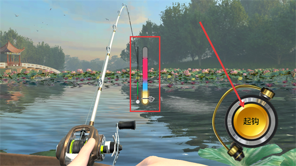 2、魚咬鉤后會出現(xiàn)力度條,此時需關(guān)注力度變化,在合適時機點擊起鉤按鈕,確保成功鉤住魚。