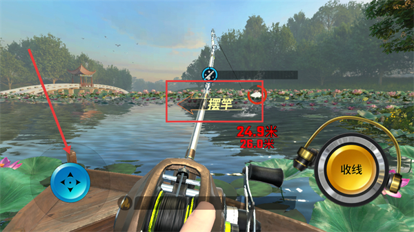 4、收線時若出現(xiàn)擺竿提示,需通過左側(cè)方向鍵按照指示方向擺動魚竿,控制魚的游動方向,防止魚逃脫。
