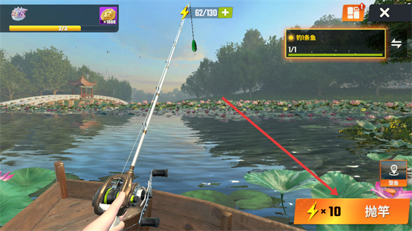 1、點擊拋竿按鈕將釣餌拋入水中,拋竿前可觀察水域環(huán)境,選擇魚群活躍的區(qū)域,提升中魚概率。
