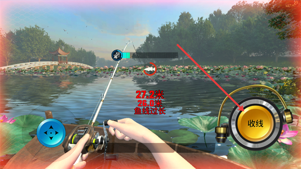 3、起鉤后點擊收線按鈕開始收線,收線過程中若提示魚線過長需及時調(diào)整收線節(jié)奏,避免魚線斷裂。