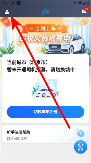 1、打開(kāi)吉刻上車車主端,點(diǎn)擊左上角個(gè)人圖標(biāo),進(jìn)入個(gè)人頁(yè)面。
