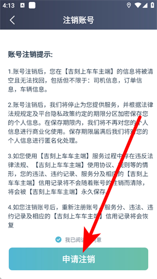 5、在注銷頁(yè)面,勾選后,點(diǎn)擊申請(qǐng)注銷,完成賬號(hào)注銷操作。