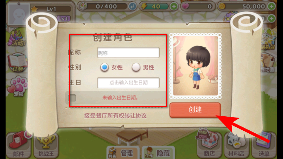 1、進(jìn)入萌萌餐廳游戲,在創(chuàng)建角色界面填寫(xiě)昵稱、選擇性別、輸入出生日期后,點(diǎn)擊創(chuàng)建按鈕,創(chuàng)建游戲角色。