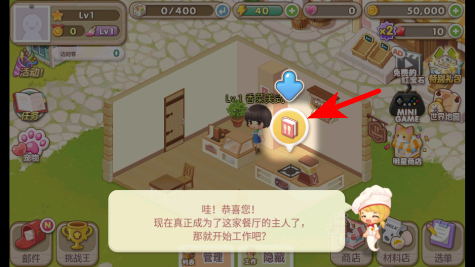 2、角色創(chuàng)建完成后,在餐廳界面點(diǎn)擊帶有書(shū)本圖標(biāo)的引導(dǎo)區(qū)域,開(kāi)始餐廳經(jīng)營(yíng)的初始操作。