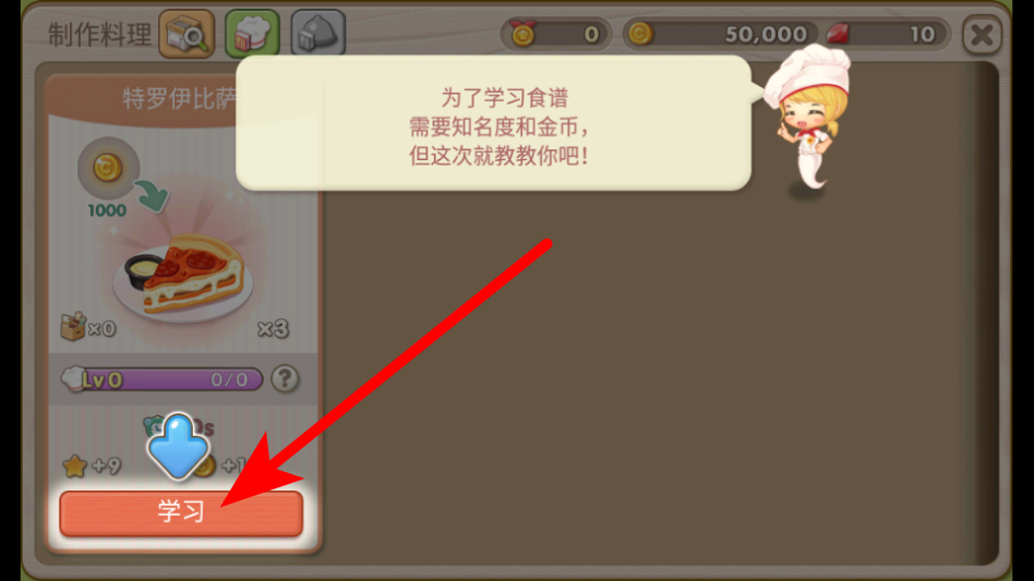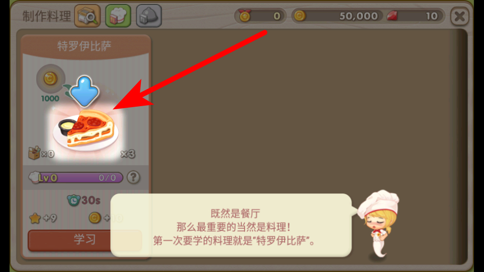 4、在料理學(xué)習(xí)界面,點(diǎn)擊學(xué)習(xí)按鈕,開(kāi)始學(xué)習(xí)特羅伊比薩的制作食譜,開(kāi)啟餐廳料理制作的經(jīng)營(yíng)環(huán)節(jié)。