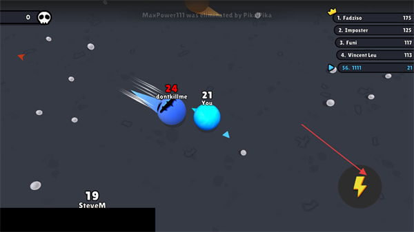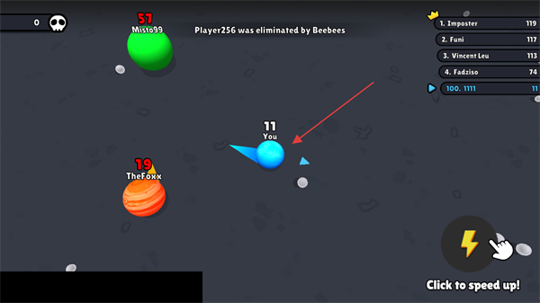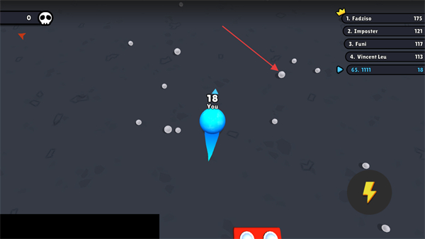 3、在地圖內(nèi)不斷吞噬散落的小球進(jìn)行體型的增長(zhǎng),注意躲避其他大球。