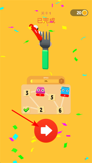 2、關(guān)卡完成后,點(diǎn)擊紅色繼續(xù)按鈕可進(jìn)入下一關(guān),繼續(xù)前需關(guān)注本關(guān)獲得的金幣數(shù)量,為后續(xù)關(guān)卡積累資源。