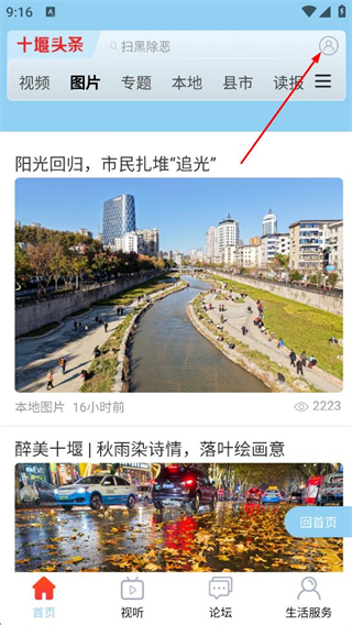 1、在十堰頭條APP首頁,點擊右上角用戶圖標,進入個人中心頁面。