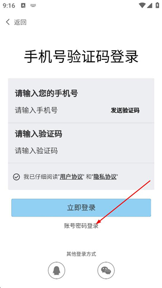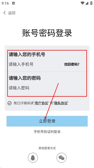 4、在賬號密碼登錄界面,輸入手機號和密碼,點擊立即登錄,完成登錄操作。
