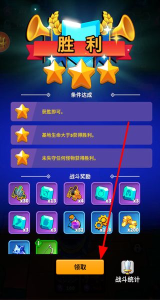 4、領(lǐng)取戰(zhàn)斗獎(jiǎng)勵(lì),戰(zhàn)斗勝利后領(lǐng)取獎(jiǎng)勵(lì),獲取資源和道具,用于角色和防御塔養(yǎng)成,豐富游戲體驗(yàn)。