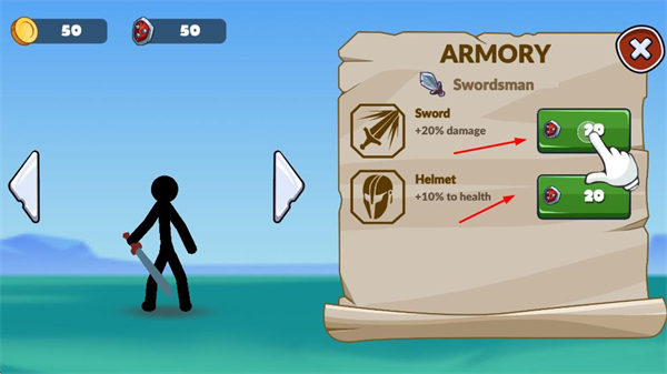4、在軍械庫升級士兵裝備如劍、頭盔,提升士兵戰(zhàn)力,應對更強敵人。