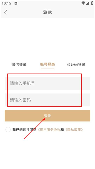 4、在賬號(hào)登錄界面填寫(xiě)手機(jī)號(hào)、密碼,勾選協(xié)議后,點(diǎn)擊登錄完成登錄操作。