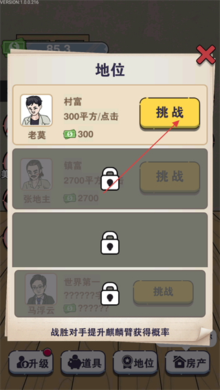 1、進(jìn)入游戲后點(diǎn)擊下方的地位按鍵,開(kāi)始挑戰(zhàn)不同地位的人物。