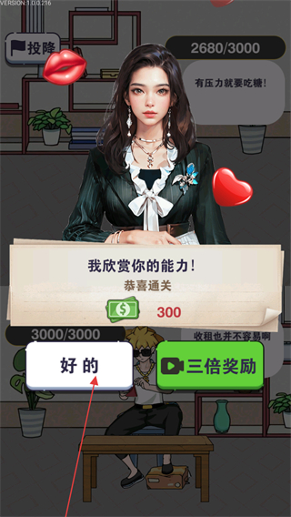 3、通關(guān)后可以獲得美女獎(jiǎng)勵(lì)的金錢,點(diǎn)擊好的可以回到游戲主頁(yè)。