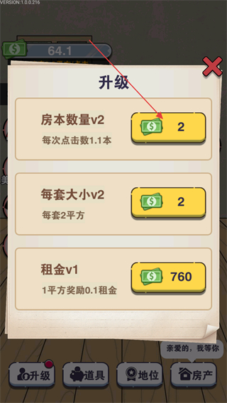 2、點(diǎn)擊下方的升級(jí)按鈕,選擇升級(jí)租房的房本數(shù)量和每套大小以及租金來(lái)加快賺錢速度。