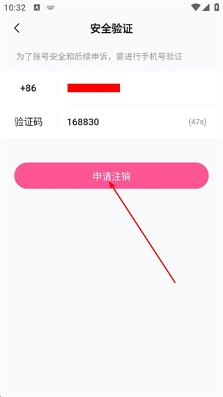 5、在安全驗(yàn)證頁(yè)面,輸入驗(yàn)證碼后點(diǎn)擊申請(qǐng)注銷,完成賬號(hào)注銷操作。