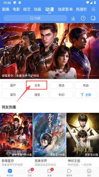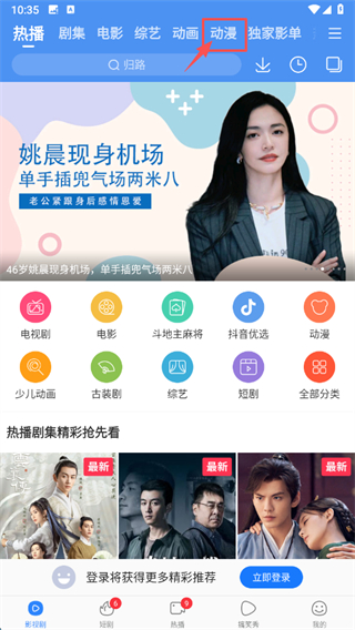 1、打開(kāi)視頻類(lèi)應(yīng)用,點(diǎn)擊頂部動(dòng)漫分類(lèi)標(biāo)簽,進(jìn)入動(dòng)漫專(zhuān)屬頁(yè)面。