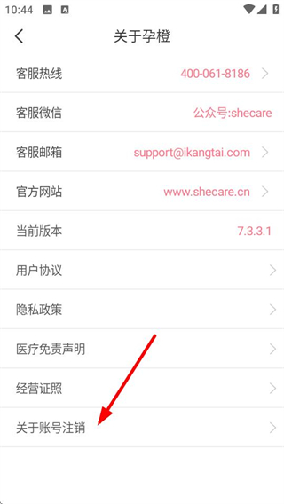 3、在關(guān)于孕橙頁(yè)面,點(diǎn)擊關(guān)于賬號(hào)注銷選項(xiàng),進(jìn)入孕橙賬號(hào)安全頁(yè)面。