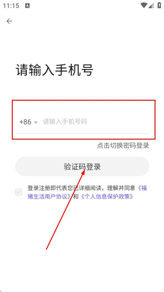 3、在手機號輸入頁面填寫手機號碼后,點擊驗證碼登錄按鈕。