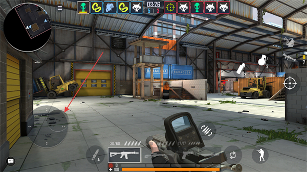 1、使用左側(cè)虛擬搖桿移動角色,在倉庫場景中探索,尋找敵人位置。