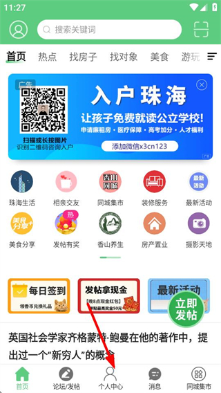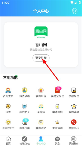 1、在香山網(wǎng)首頁,點擊底部個人中心選項,進入個人中心頁面。