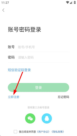 3、在賬號密碼登錄頁面,點擊立即注冊選項,進入輸入手機號頁面。