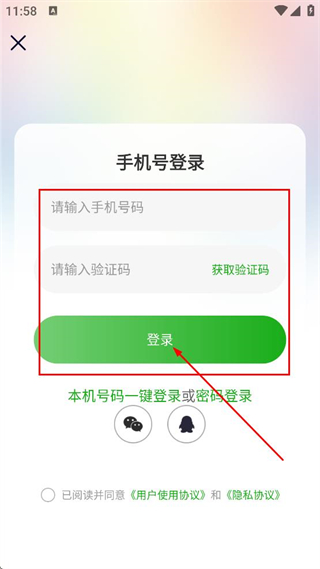 4、在登錄界面,輸入手機(jī)號(hào)碼、驗(yàn)證碼,點(diǎn)擊登錄,完成登錄操作。