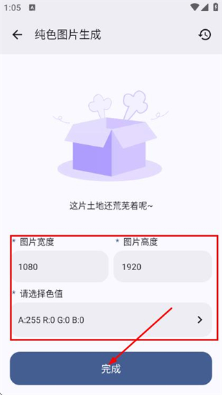 3、在純色圖片生成頁面填寫圖片寬高、選擇色值后,點擊完成生成純色圖片。