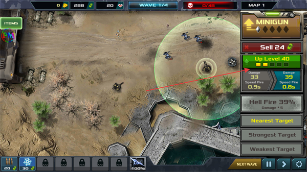 4、升級(jí)防御塔如MINIGUN,提升其火力和攻速,增強(qiáng)防御能力,應(yīng)對(duì)后續(xù)波次敵人。
