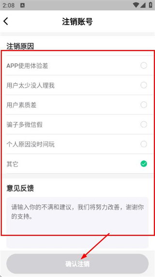 5、在注銷賬號頁面選擇注銷原因、填寫意見反饋后,點擊確認注銷完成賬號注銷操作。