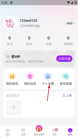 2、在個人頁面點擊個人設置,進入設置頁面。