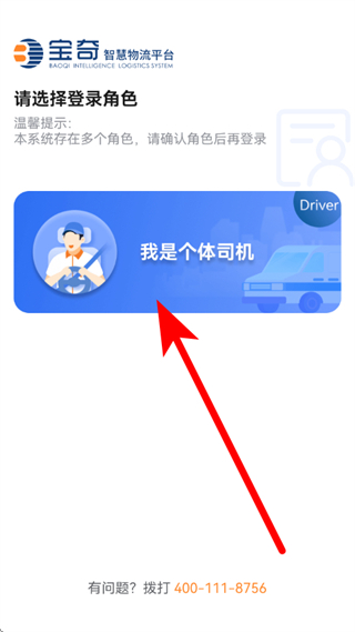 1、打開中寶智運,選擇登錄角色,點擊我是個體司機。