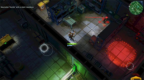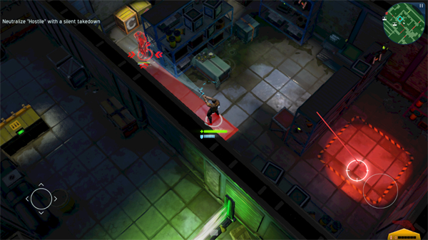 3、在地圖上會遇到腳底帶有紅色箭頭的敵人逃犯,注意躲避他們的視線進入視線盲區(qū)進行攻擊。