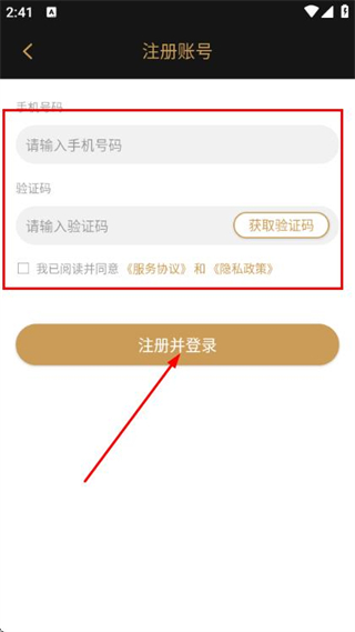 3、在注冊賬號頁面填寫手機號碼、獲取并輸入驗證碼,勾選服務(wù)后,點擊注冊并登錄完成賬號注冊操作。