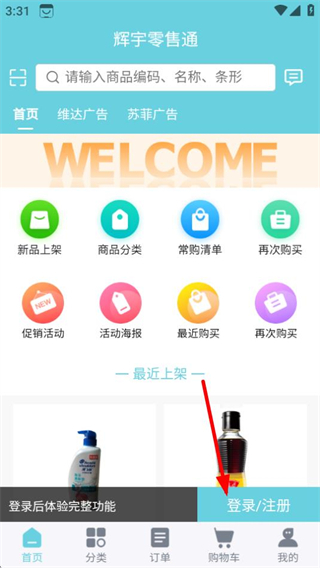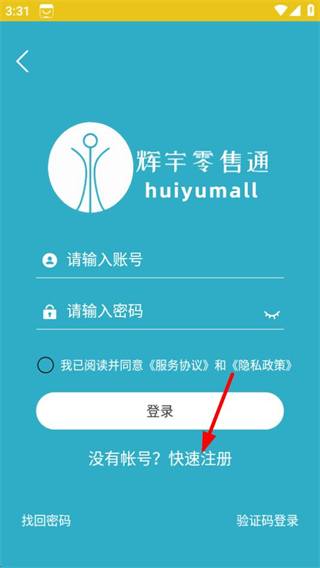 1、在輝宇零售通首頁(yè),點(diǎn)擊登錄注冊(cè)按鈕,進(jìn)入登錄頁(yè)面。