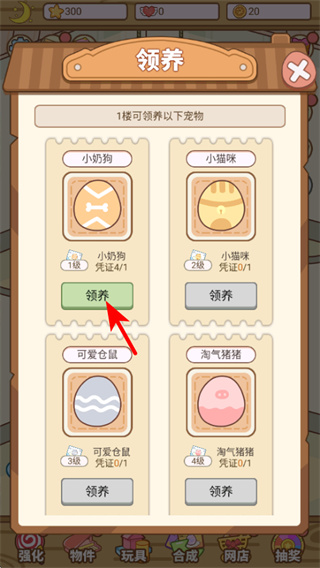 3、在領(lǐng)養(yǎng)界面點擊領(lǐng)養(yǎng)按鈕,可獲得寵物蛋,孵化后就能擁有可愛的寵物,豐富店鋪的寵物種類。