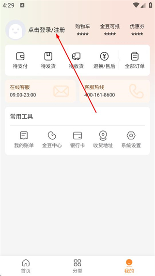 2、在個人中心頁面,點擊點擊登錄/注冊,進入登錄注冊頁面。